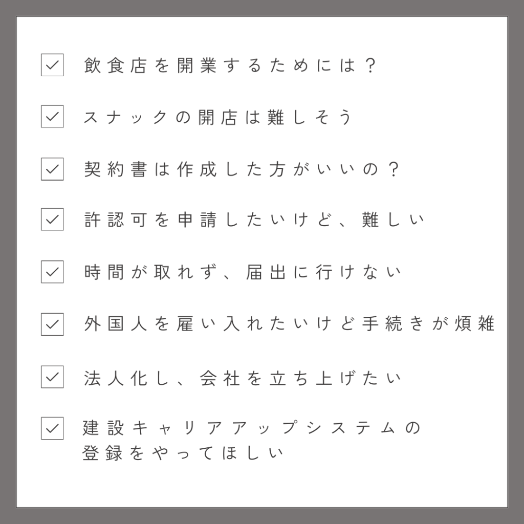 法人設立や飲食業から風俗営業まで、建設や外国人関連など